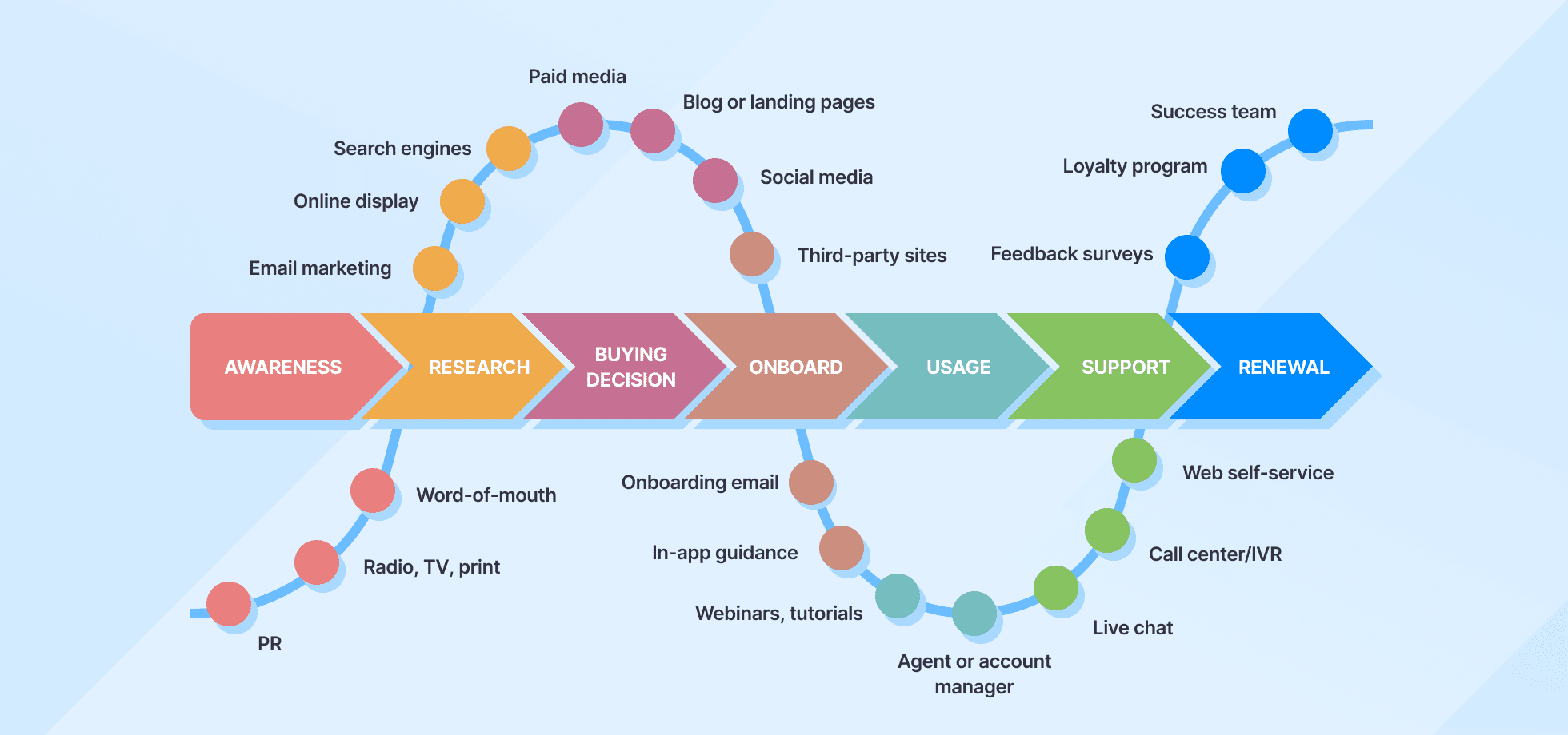 Mỗi giai đoạn nên xác định rõ: mục tiêu của khách, điểm chạm chính, chỉ số cần theo dõi.