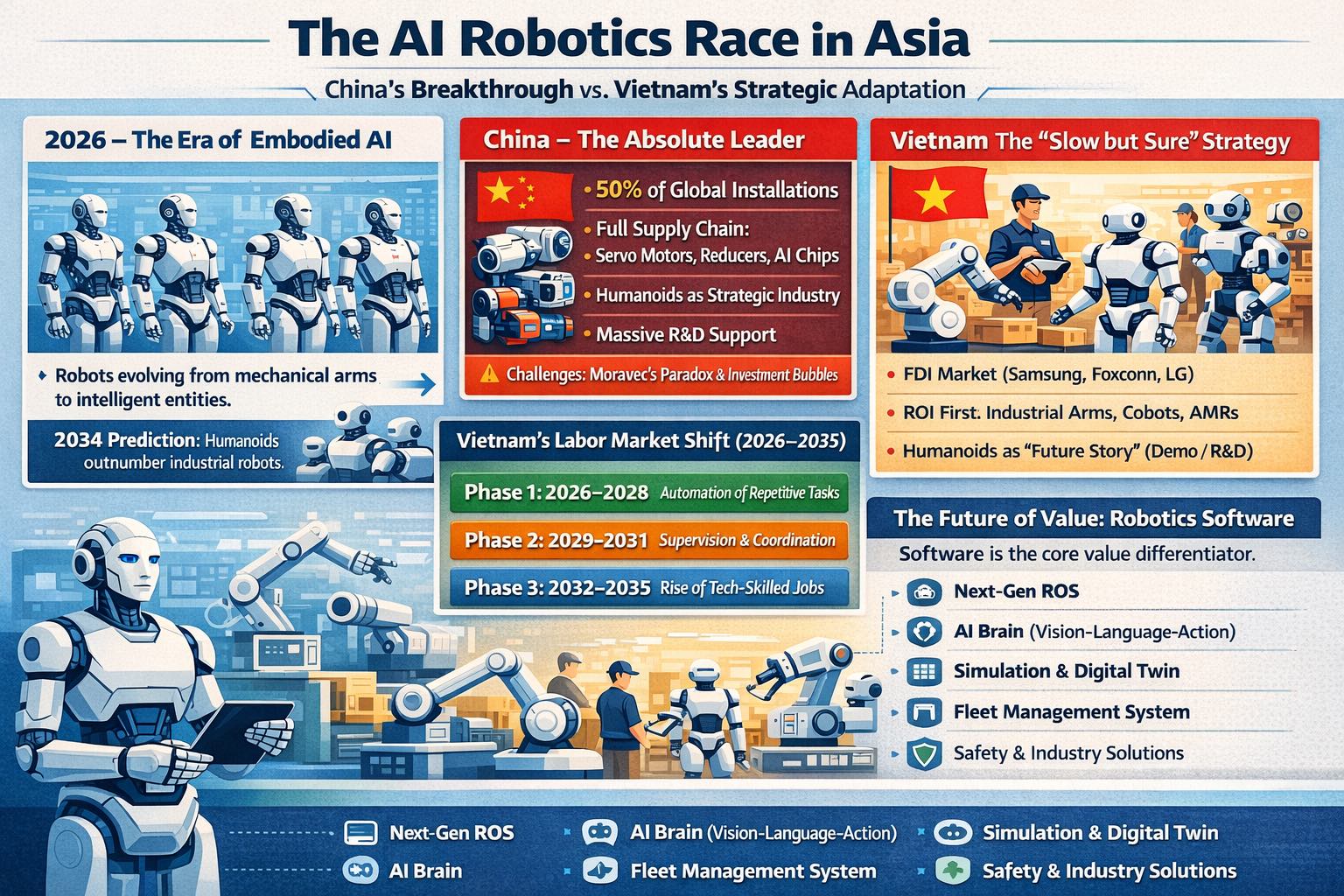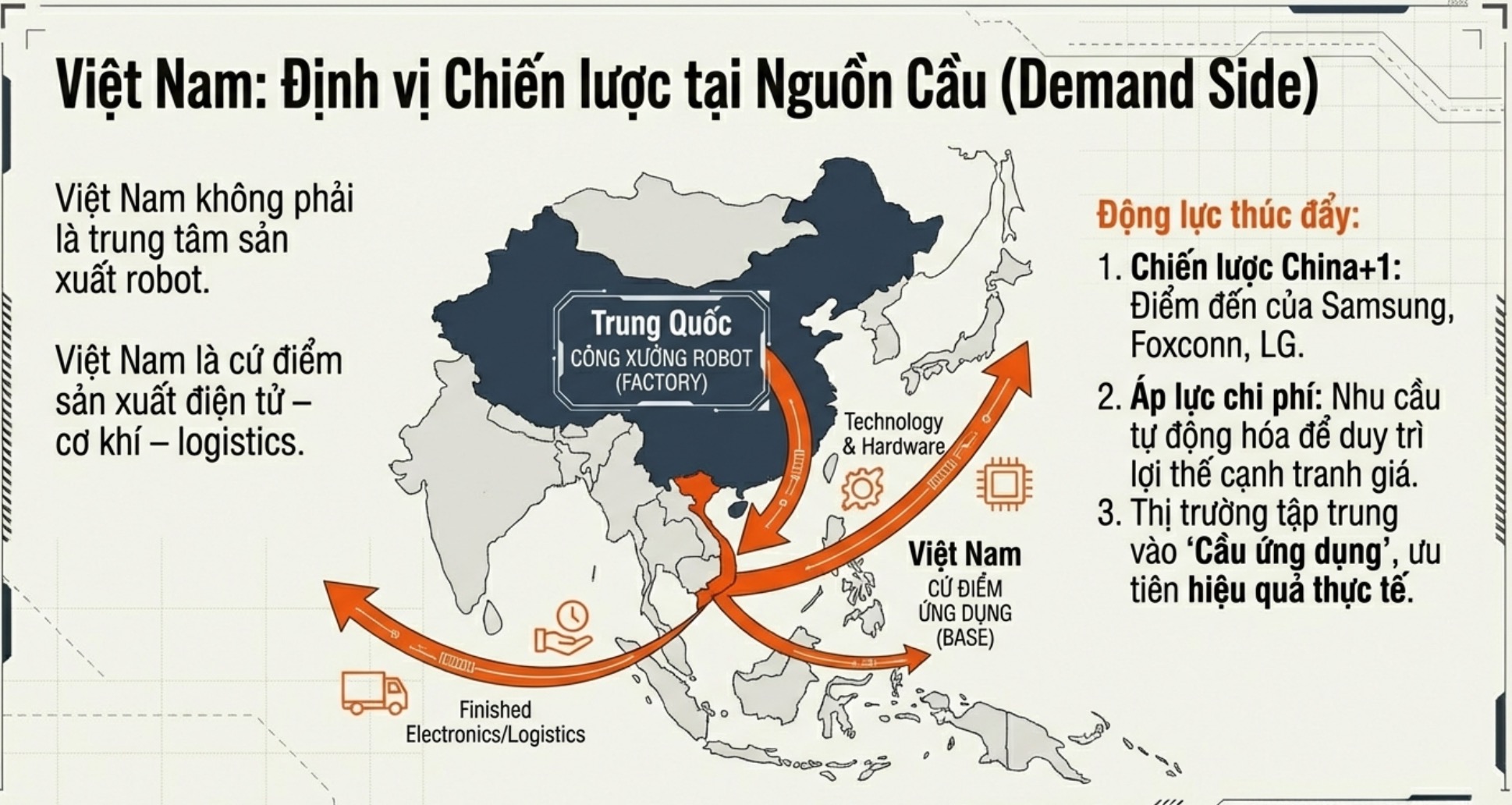 Việt Nam không đặt mục tiêu cạnh tranh ở mảng sản xuất phần cứng robot với Trung Quốc. Thay vào đó, chúng ta đang định vị mình là một “Cường quốc ứng dụng” chiến lược trong làn sóng “China+1”.