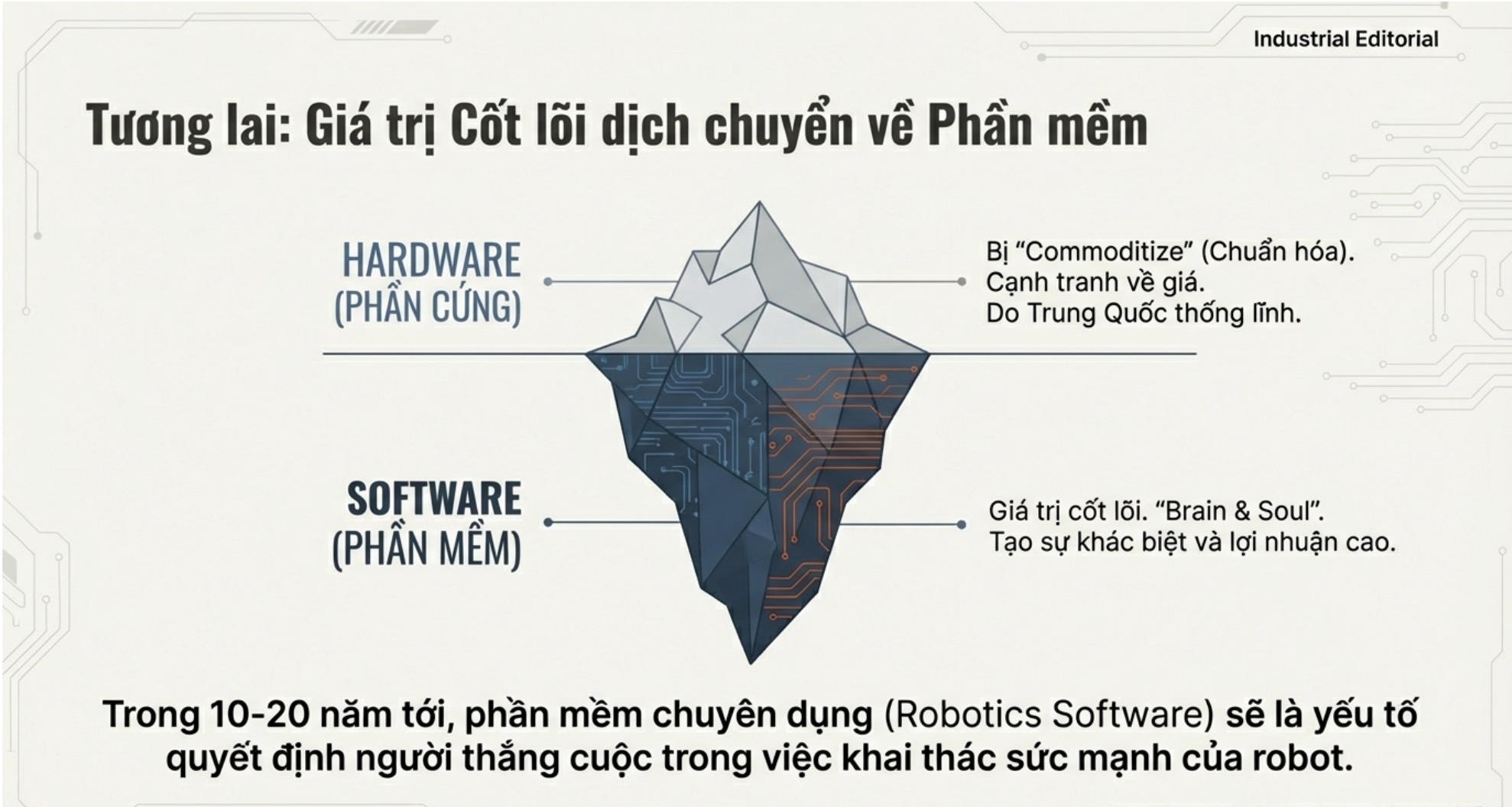 Thị trường tương lai sẽ không chuộng những con robot “đa năng nhưng không tinh”, mà sẽ hướng tới Robot chuyên nhiệm + Phần mềm chuyên ngành. Nguyên tắc vàng ở đây là: Ai hiểu quy trình ngành sâu, người đó thắng.