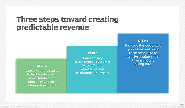 Doanh thu có thể dự đoán, định kỳ. Các dịch vụ được quản lý (Managed Service) được bán dưới dạng đăng ký, với khách hàng trả phí hàng tháng. Cách tiếp cận này cung cấp một dòng doanh thu định kỳ hàng tháng (MRR) nhất quán cho MSP – Managed Service Provider, trái ngược với sự khó lường của việc tạo ra doanh thu từ các dự án một lần. Sự ổn định của MRR là một phần trong những gì đã thu hút các nhà đầu tư vào lĩnh vực MSP – Managed Service Provider. Vì vậy, mặc dù doanh nhân có thể không cần chiến lược thoái vốn, nhưng thật tốt khi biết rằng một chiến lược tồn tại.