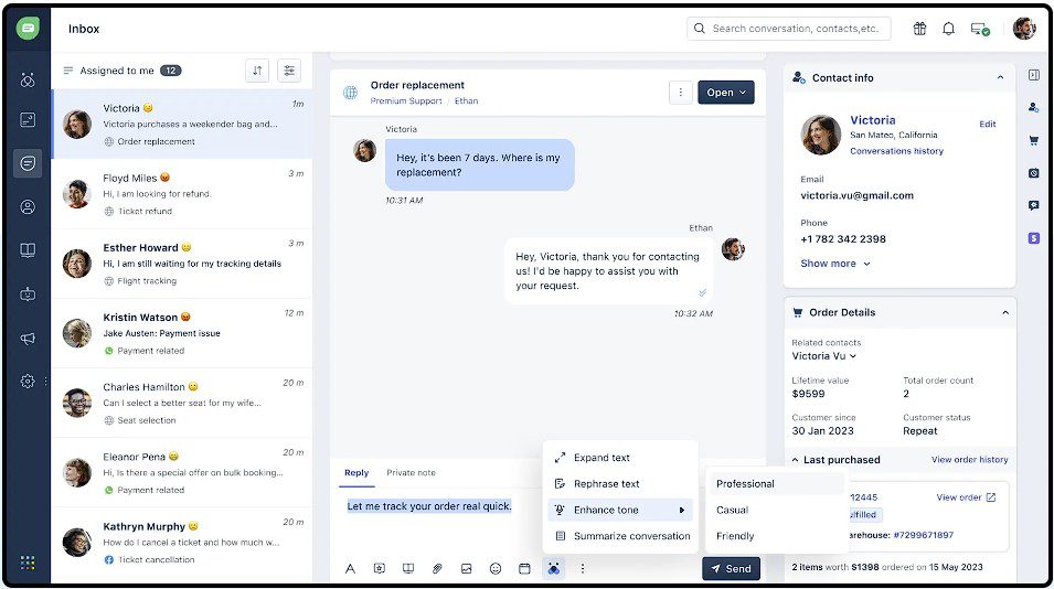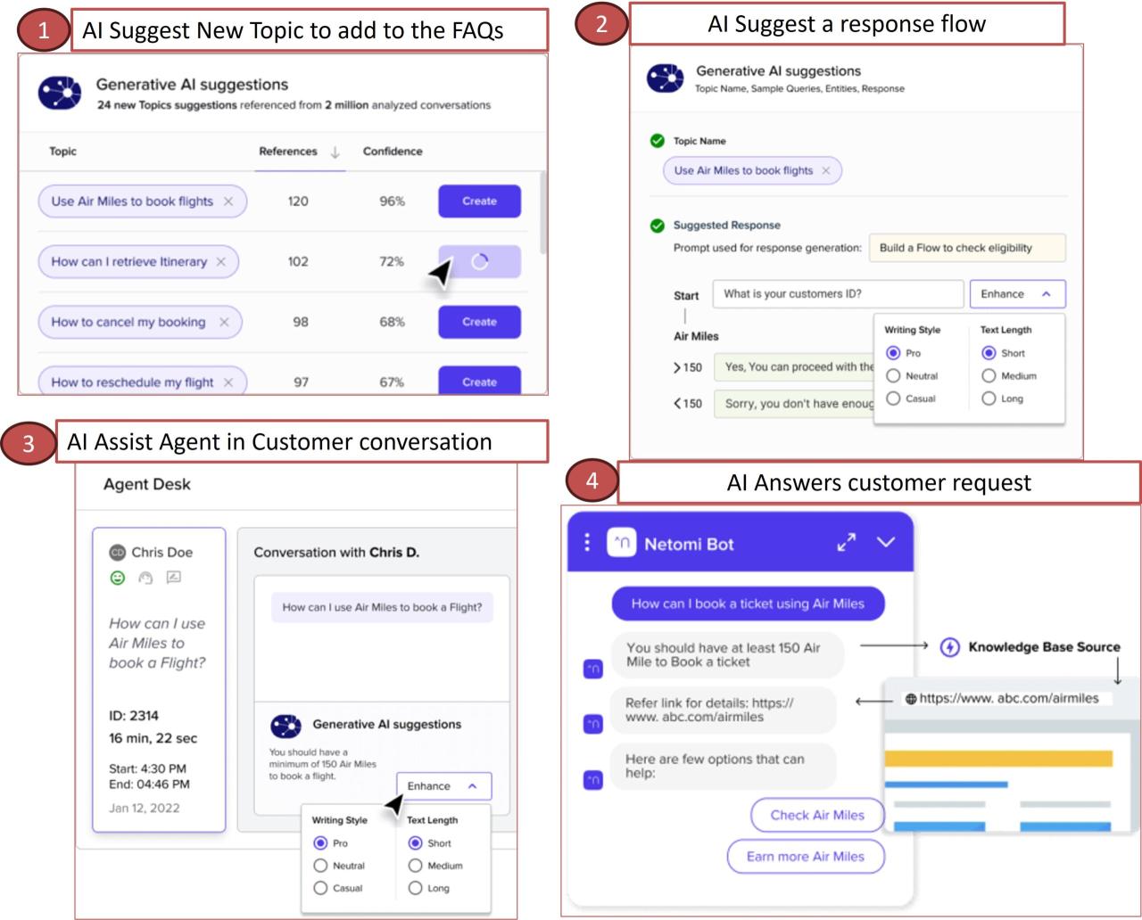Với sự trợ giúp của AI tổng quát được tăng cường với học máy, các cuộc trò chuyện của khách hàng có thể được tự động hóa và / hoặc tăng cường với sự hỗ trợ của con người. Yêu cầu có thể được định tuyến tự động dựa trên phân tích cuộc trò chuyện theo thời gian thực, sở thích của khách hàng và bối cảnh kinh doanh. Trợ lý ảo bot AI có quyền truy cập vào toàn bộ ngữ cảnh của cuộc trò chuyện và có thể chuyển sang trò chuyện có sự hỗ trợ của con người. Đối với một số trường hợp, có khả năng thực hiện chuyển đổi bước xuống trở lại trợ lý ảo. AI có thể hoạt động như một tác nhân tự động hóa hoàn toàn hoặc hỗ trợ tác nhân thời gian thực để soạn thảo phản hồi cho các tác nhân xác nhận hoặc chỉnh sửa.