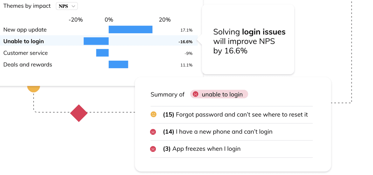 Với sự trợ giúp của các thuật toán AI và sử dụng phân tích theo chủ đề, các nhà lãnh đạo trải nghiệm khách hàng có thể tạo ra những hiểu biết có thể hành động từ các mẫu quan trọng nhất trong phản hồi của khách hàng. Họ có thể lọc siêu dữ liệu và lưu các phân khúc khách hàng, chẳng hạn như vị trí hoặc giá trị của khách hàng, để đào sâu hơn vào các vấn đề hoặc cơ hội. Ví dụ: nếu nhóm phần mềm giải quyết ‘vấn đề đăng nhập’, nó sẽ cải thiện NPS lên 16,6%.