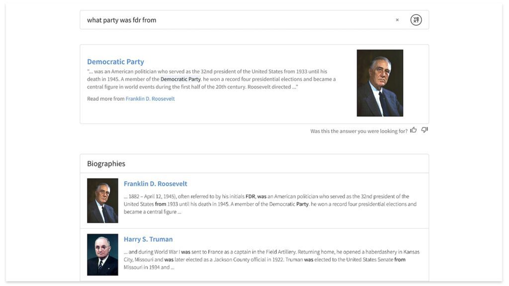 AI cũng có thể cung cấp câu trả lời trực tiếp bằng cách sử dụng hệ thống trả lời câu hỏi trích xuất (QA). Trong QA trích xuất, một phiên bản được đào tạo đặc biệt của BERT (mạng nơ-ron mã nguồn mở của Google được đào tạo để hiểu ngôn ngữ) giúp xác định các đoạn trích từ các tài liệu dài trả lời tốt nhất câu hỏi của người dùng. Nếu nó tìm thấy một câu trả lời tốt trong văn bản, thuật toán sẽ hiển thị nó dưới dạng một đoạn trích nổi bật. Những đoạn trích này cung cấp trải nghiệm tìm kiếm tuyệt vời và giúp người tìm kiếm tìm câu trả lời tốt nhất cho các truy vấn của họ, trong phần nội tuyến tập trung. Các thuật toán AI yêu cầu hướng dẫn và giám sát để xác định thông tin và dữ liệu nào là quan trọng nhất đối với các nhà quản lý để đặt nền tảng cho những hiểu biết có ý nghĩa và câu trả lời trực tiếp tốt nhất.