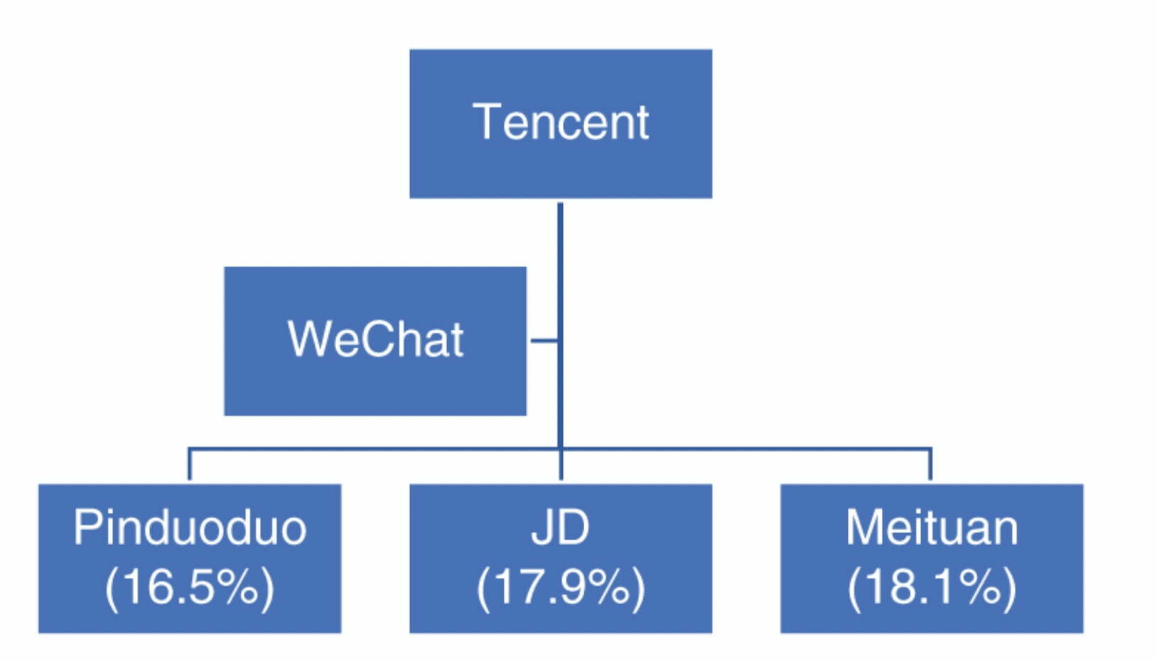 Tất nhiên, bụi vẫn chưa lắng xuống. Xem xét kỹ hơn danh sách 5 công ty hàng đầu cho thấy sự thật gây sốc rằng Alibaba là người duy nhất trong đế chế Tencent. Đối với Meituan-Dianping, JD.com và Pinduoduo — đối thủ cạnh tranh trực tiếp của Alibaba — Tencent không chỉ là đối tác chiến lược, (ứng dụng WeChat có mặt khắp nơi cung cấp khoảng 1 tỷ lưu lượng người dùng hoạt động hàng tháng cho các doanh nghiệp thương mại điện tử và dịch vụ online của họ), mà còn là nhà đầu tư chiến lược. Không được công chúng biết đến rộng rãi, Tencent nắm giữ 18,1% Meituan-Dianping, 17,9% JD.com và 16,5% Pinduoduo, theo hồ sơ công khai của các công ty vào năm 2020