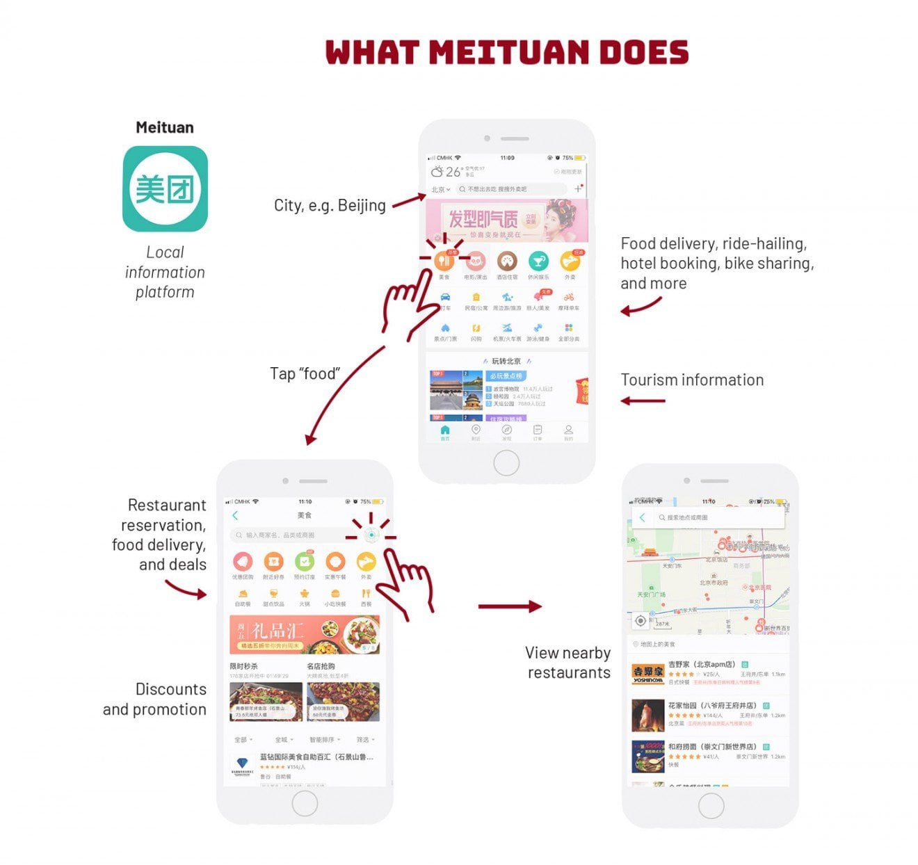 - Meituan-Dianping: Đây là công ty kết hợp từ sự hợp nhất giữa nền tảng O2O hàng đầu của Trung Quốc về dịch vụ cuộc sống địa phương và đánh giá khách hàng (tương đương với sự kết hợp giữa Groupon và Yelp ở Hoa Kỳ). Đó là nền tảng tất cả trong một lớn nhất Trung Quốc để giao đồ ăn, đặt vé xem phim, đánh giá nhà hàng và giảm giá theo nhóm, cùng nhiều thứ khác. Dựa trên các dịch vụ này, nó cũng chuyển sang dịch vụ chia sẻ xe hơi và xe đạp. Năm 2018, Meituan-Dianping IPO trên sàn chứng khoán Hồng Kông và vào giữa năm 2020, thị trường của công ty định giá hơn 130 tỷ đô la Mỹ, khiến nó trở thành công ty Internet Trung Quốc có giá trị thứ ba.