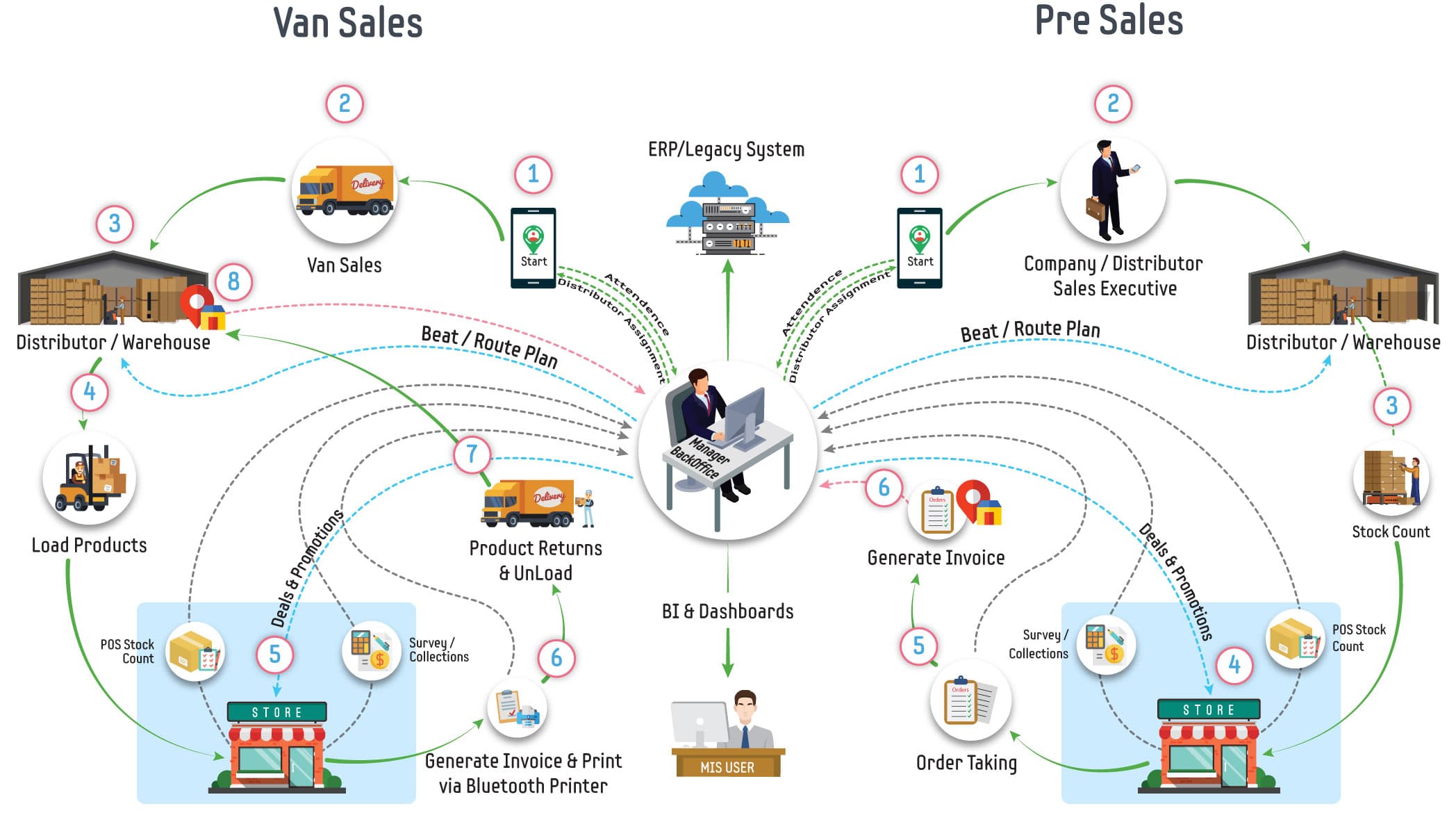 👉 Dòng dữ liệu: SFA + POS → DMS (ghi nhận sell-in + sell-out data)