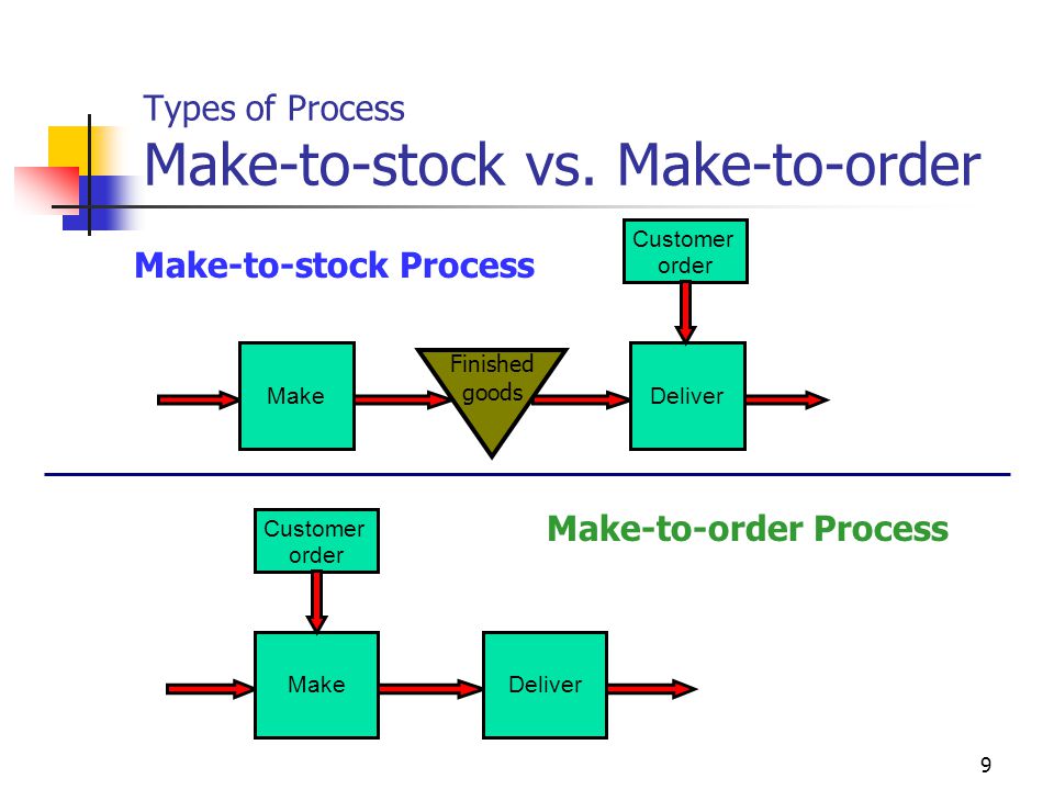 Make-to-order – sản xuất theo đơn đặt hàng là các sản phẩm được sản xuất khi doanh nghiệp nhận đơn đặt hàng của khách hàng. Nếu doanh nghiệp của bạn được thực hiện để đặt hàng, điều đó có nghĩa là khách hàng sẽ phải chờ sản phẩm, tuy nhiên điều này cho phép cá nhân hóa nhiều hơn vì khách hàng có cơ hội tùy chỉnh đơn hàng của họ.