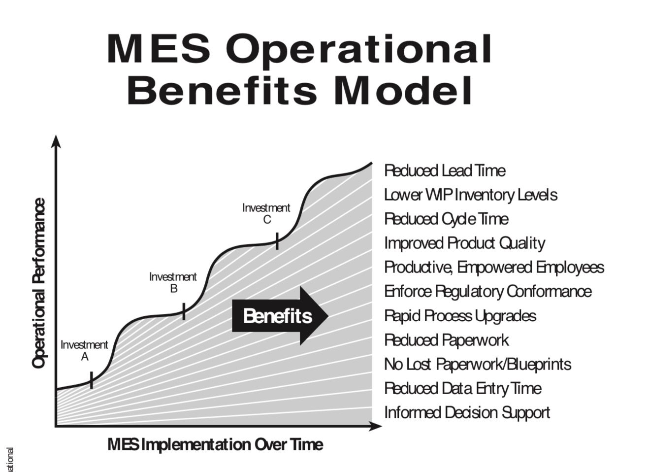 MES thường được tích hợp với ERP, quản lý chuỗi cung ứng , quản lý vòng đời sản phẩm và các hệ thống CNTT quan trọng khác. Lợi ích chính của việc sử dụng MES bao gồm: