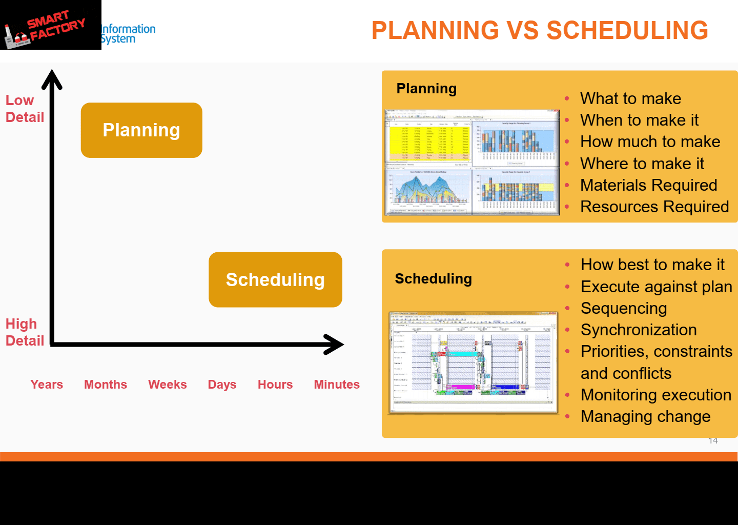 ERP được sử dụng để tạo, lập kế hoạch (có tính dài hạn) và quản lý lịch trình cơ bản của nhà máy bao gồm sản xuất, sử dụng vật liệu, giao hàng và vận chuyển, làm cho thông tin trở thành trung tâm của hoạt động.Các mô-đun ERP thường là sự kết hợp giữa sản xuất, chuỗi cung ứng, xử lý đơn hàng, quản lý hàng tồn kho, nguồn nhân lực và quản lý quan hệ khách hàng. Nó tập trung vào làm việc trong khung thời gian của tháng, tuần và ngày.