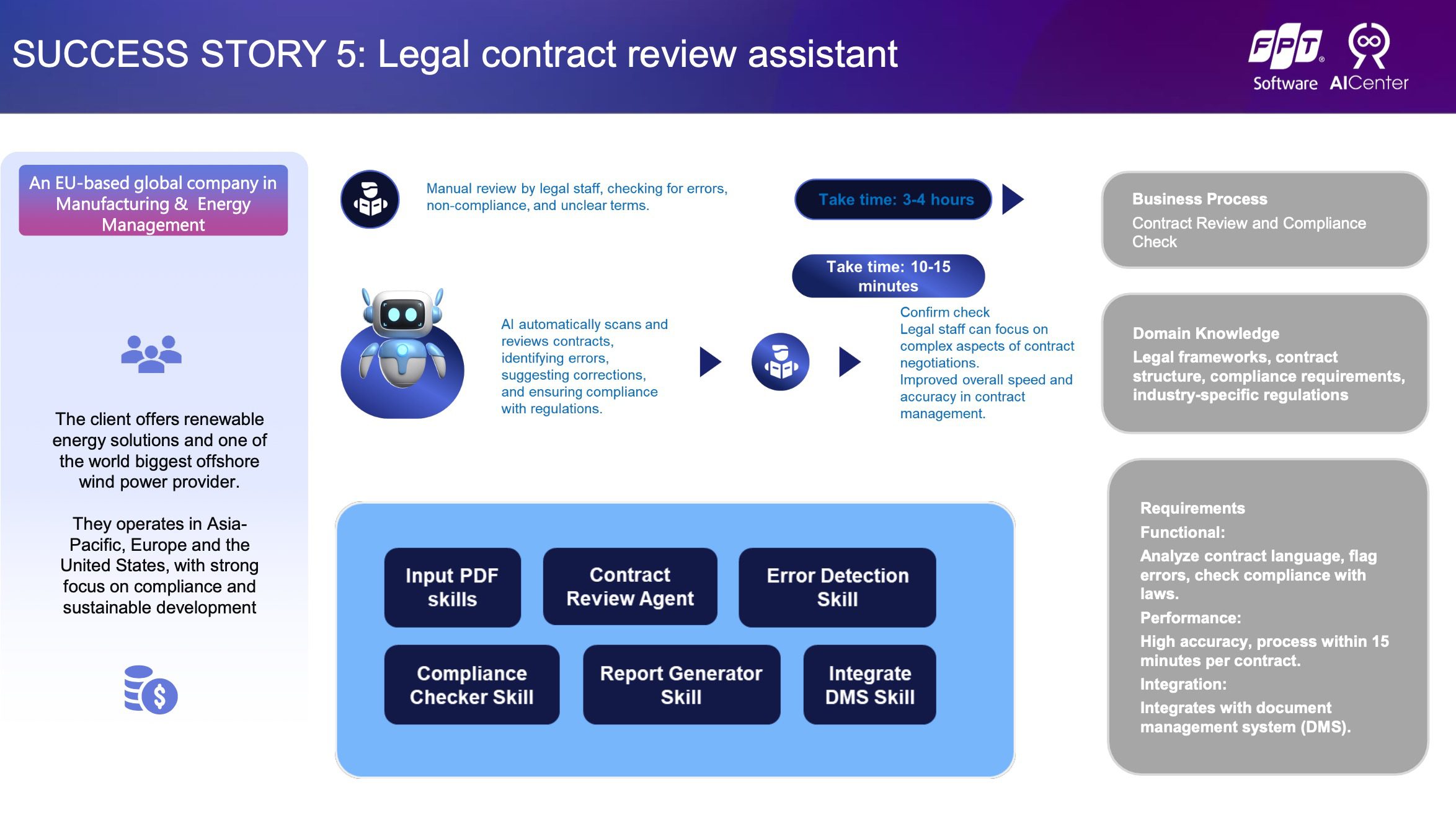 - Nâng cao năng suất & giảm lỗi con người: Giải phóng đội ngũ pháp chế khỏi công việc lặp lại, nhàm chán, giúp họ tập trung vào những nhiệm vụ phức tạp, đòi hỏi tư duy chiến lược.