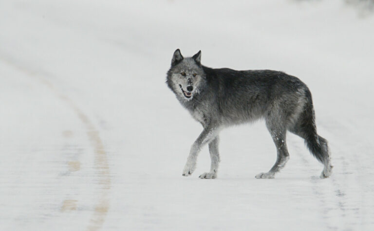 (Nguồn ảnh: “Black and grey wolf (female from Druid pack, ‘Half Black’) walking in road near Lamar River bridge” do YellowstoneNPS cung cấp, thuộc Public Domain Mark 1.0.)